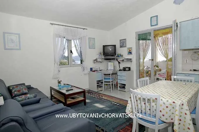 Zeleny apartman Skládá se z obývacího pokoje, jehož součástí je i malá kuchyně - 15 m2, kde je možnost 2 přístýlek Ve druhém pokoji je manželská postel a ještě další postel – dohromady tedy 3-4 lůžka