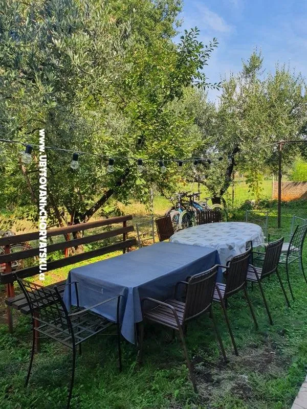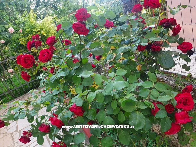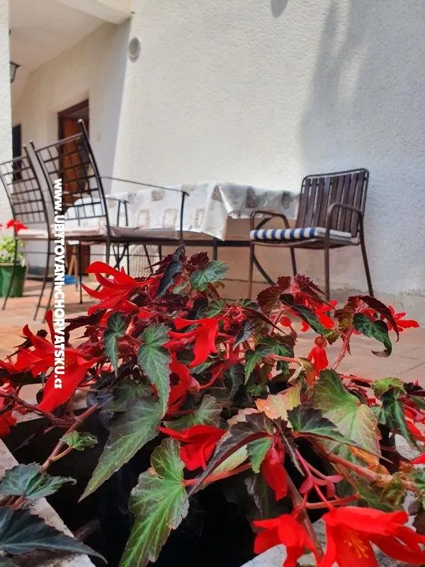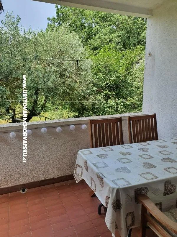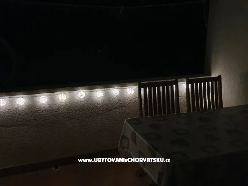 Prostorný byt se nachází v přízemí. Koupelna s WC + samostatné WC, pračka, velký krytý balkon s velkým stolem a židlemi pro 6 a více osob + terasa se stolem a židlemi.