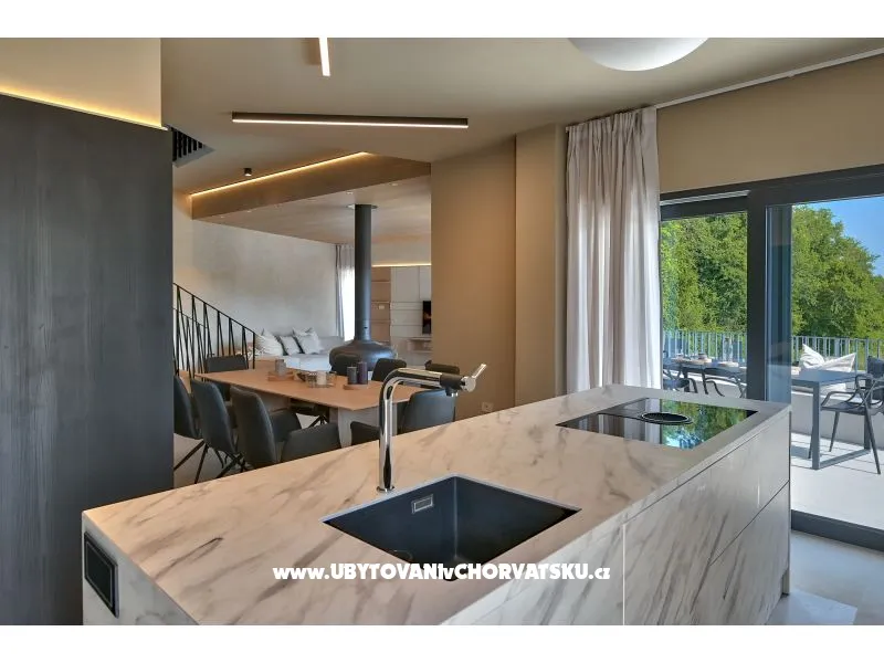 Luxusní vila Itea vás zve na vysněnou dovolenou do pohádkového městečka Vabriga na severozápadním pobřeží Istrie. Kromě bohaté gastronomické nabídky a krásných pláží v dosahu vám Istrie nabízí možnost prozkoumat četné vinné stezky, kterými je tento chorvatský region proslulý. Vila Itea zaujímá plochu 180 m2 a je postavena v moderním stylu s kontrastními povrchy minimalistického designu a má ubytovací kapacitu pro maximálně 8 osob. Ze 4 ložnic s plně vybavenými koupelnami se jedna nachází v přízemí a další 3 v horním patře vily. K dispozici je pračka a žehlička. Každý pokoj má vlastní terasu s výhledem na zeleň a nedotčenou přírodu. V přízemí vily se nachází prostorná jídelna s kuchyní a obývací pokoj vybavený rohovou pohovkou, konferenčním stolkem, krbem, herní konzolí a deskovými hrami. Na terase vily se nachází krásný bazén o rozloze 26 m2 a hloubce 1,5 m s možností hydromasáže na jedné straně bazénu. Kolem bazénu je 8 lehátek, k dispozici je také venkovní jídelní stůl a venkovní gril. Villa Itea nabízí mnoho dalších zábavních zařízení, jako jsou kola nebo elektrické koloběžky. V plně oploceném dvoře vily jsou k dispozici 3 parkovací místa. Okolí vily nabízí potěšení z romantických procházek v nedotčené přírodě a na nejbližší pláži, necelé 2 km od vily, si můžete užít vodní sporty a krásné Jaderské moře. Nedaleko se nachází tajemná jeskyně Baredine, kde objevíte skutečnou pokladnici podzemních soch uspořádaných v pěti sálech. Jeskyně Baredine také skrývá legendu ze 13. století, milostný příběh o šlechtici Gabrielovi, který se zamiluje do pastýřky Milky. Gabrielova matka se jejich lásce bránila, a tak najatí lupiči dívku hodili do jámy. Gabriel pak zmizel i se svým koněm a krátce nato našli pouze koně poblíž východu z jiné nedaleké jámy. Podle legendy zkamenělé tělo pastýřky každý den klouže hlouběji a hlouběji do jámy, aby se na druhé straně setkalo se svým milovaným. Istrie je pohádkou nejen díky svým rozmanitým a zajímavým místům, ale také kvůli četným středověkým pevnostem a městům, které svědčí o bohaté historii tohoto regionu. Například město Motovun v centru Istrie je skutečným centrem středověkých pevností a v letních měsících se zde koná filmový festival. Na istrijském pobřeží najdete městská centra jako Umag, Poreč, Rovinj nebo Pula, která sahají až do předantické doby. Například v Pule na jihu Istrijského poloostrova budete moci vidět římský amfiteátr, který je také známý jako největší dochovaná památka starověku. O něco severněji, ve městě Poreč, si můžete prohlédnout unikátní komplex raně křesťanské sakrální architektury ze 6. století, který je jednou z nejkrásnějších dochovaných památek byzantského umění. Istrie má také bohatou nabídku jídla a vína, vzhledem k tomu, že se jedná o region s mimořádně příznivou geografickou polohou, dnes z Istrie pocházejí nejlepší vína a olivový olej. Nenechte si ujít další zajímavé recepty, jako je istrijské maso boškarina, intenzivní lanýže nebo tradičně připravované těstoviny. Pokud chcete, aby se vaše dovolená proměnila ve skutečnou oázu klidu a soukromí, vyberte si vilu Itea, která vám poskytne luxus, který si zasloužíte, a bohatá gastronomická, kulturní a sportovní nabídka Istrie vaši dovolenou doplní a učiní ji dokonalou. Upozorňujeme, že toto zařízení nepřijímá mládežnické skupiny ani rozlučky se svobodou. Mládežnická skupina v tomto zařízení se skládá z osob v dhobi do 30 osob. Nerezervujte si toto ubytování, pokud jste skupina mladých lidí nebo plánujete rozlučku se svobodou, protože vaše rezervace bude po provedení rezervace zamítnuta, což se může stát při příjezdu do zařízení nebo během vašeho pobytu, a peníze vám nebudou vráceny.