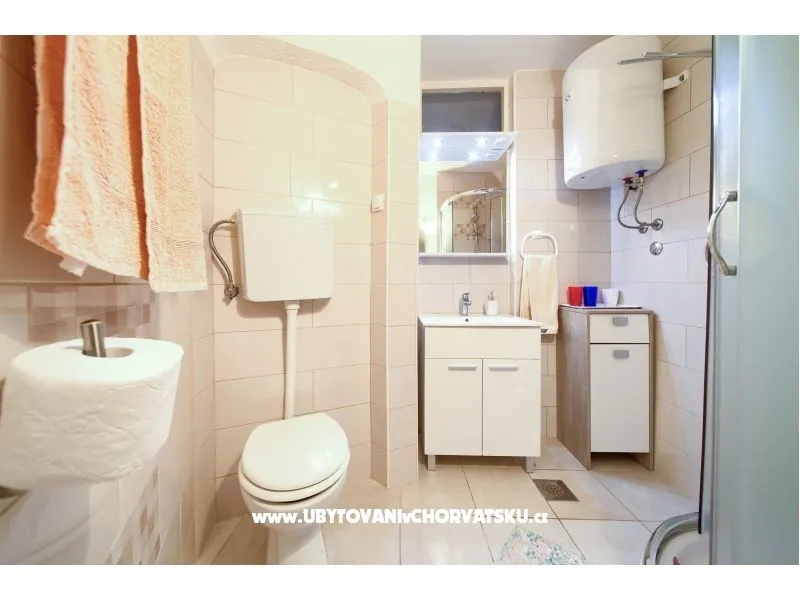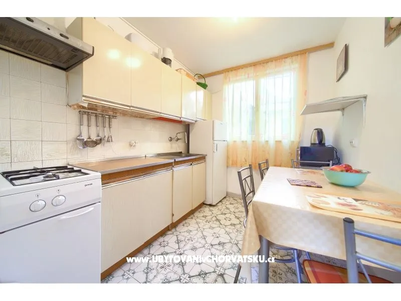 Apartmán (40m2) se skládá z 1 ložnice (manželská postel), obývacího pokoje (rozkládací pohovka pro 2 osoby), koupelny (sprcha/WC), plně vybavené kuchyně, balkonu s výhledem na moře a parkovacím místem ve dvoře, klimatizace, wifi, pračky.