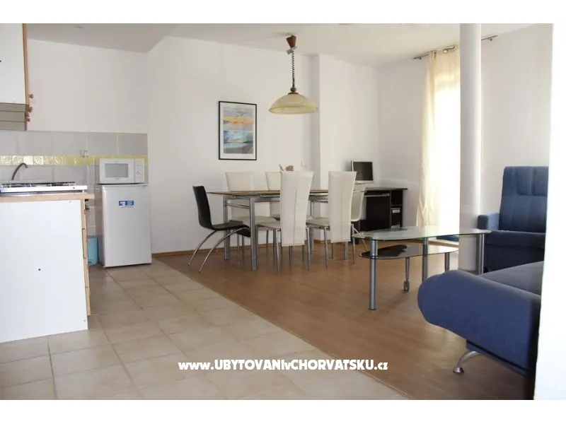 Pokoj pro 2 + 2 osoby s kuchyní, WC se sprchou a balkonem na zadní straně domu. Hosté z této místnosti mohou využívat přední balkon, který má krásný výhled na moře. Klimatizace je k dispozici za poplatek 5 Eur/den.