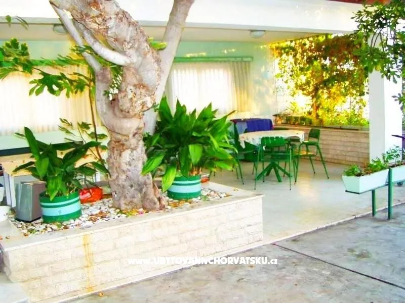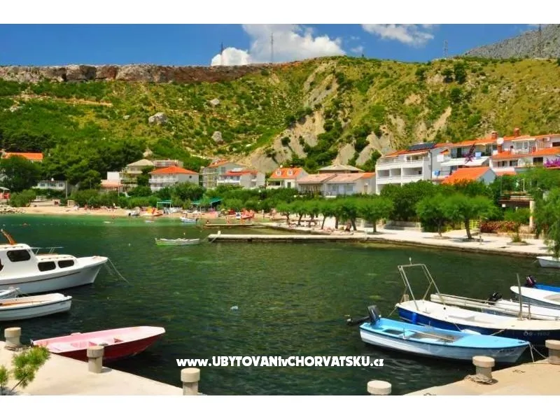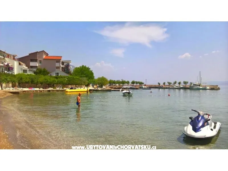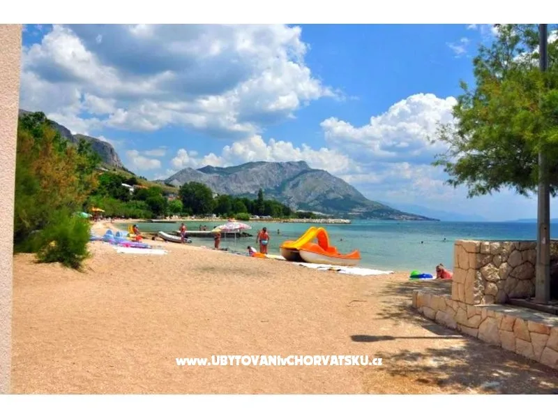 Apartmány v první řadě u moře a pláže. Dům je obklopen středomořskou florou. Některé apartmány mají klimatizaci a některé ne. V těsné blízkosti je betonová pláž (0m), písečná pláž (20m) a oblázková pláž (200m). V okruhu 2 km jsou k dispozici různé aktivity: - voleyball - běh po písečné pláži 4km dlouhé - surfing - škola potápění - rafting na řece Cetina - vodní lyžování - vodní polo - další vodní sporty - turistika - horolezectví - tenis - basketbal - malá kopaná - kola