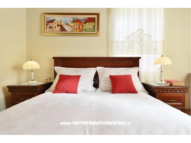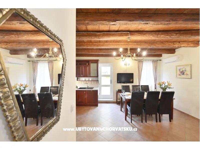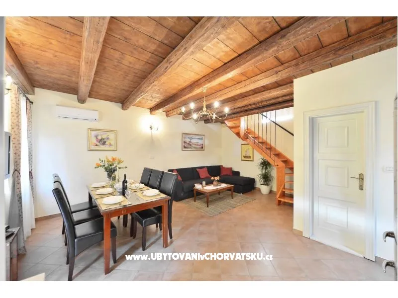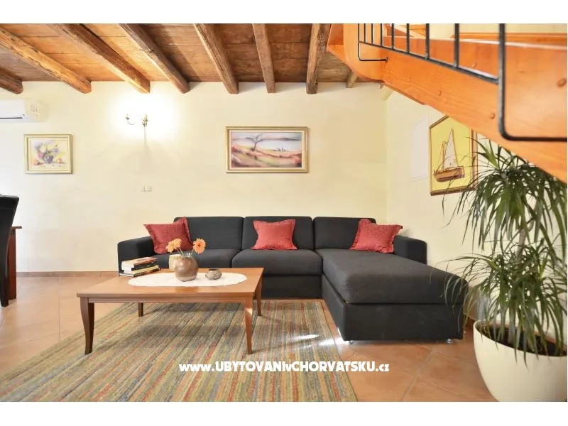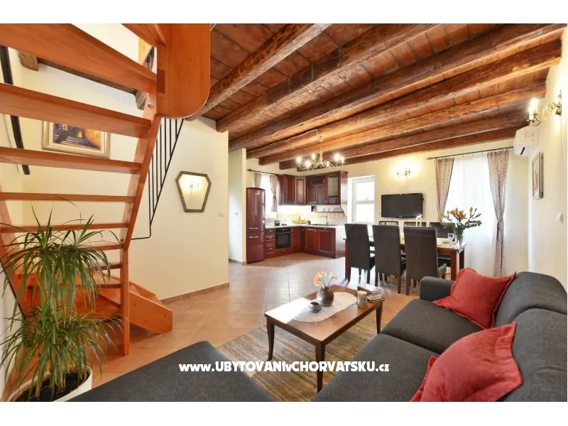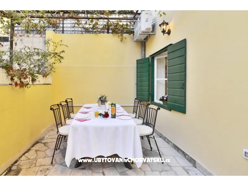 Rodinný dům v centu Omiše, pouhých třicet metrů od hlavní pláže s modrou vlajkou v klidné oblasti, daleko od hluku a silnic. Apartmán je zařízen v moderním - rustikálním stylu a plně vybavené. Skládá se z přízemí s kuchyní, jídelnou a obývacím pokojem a větší koupelny s pračkou, a na prvním patře jsou tři dvoulůžkové ložnice a druhá koupelna. Dům má zahradu s grilem a stůl pro deset lidí. Kapacita je 6 +3 osoby, protože se pohovka s matrací v přízemí rozkládá pro 2 +1 osoby. Kuchyňská linka je vybavena spotřebiči a nádobím, včetně myčky nádobí, přízemí a první patro jsou klimatizované a mají trezor, internet, SAT TV. Matrace jsou nejlepší - ortopedické a ložní prádlo je jedinečná, ručně vázaná. Parking zajištěn dvacet metrů od objektu. Vše (pobytová taxa, klimatizace, parkování ..) je zahrnuto v ceně.