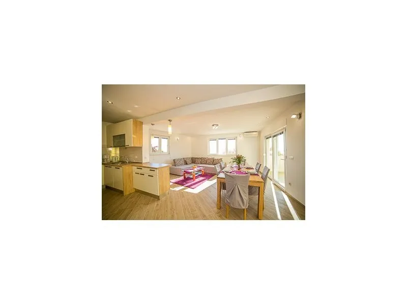 Luxusni velky apartman se dvema loznicemi, obyvacim pokojem, dvema balkony s primym vyhledem na more, jedna kuchyne a jedna koupelna. Apartman s bazenem.