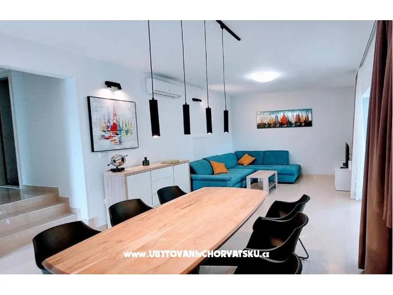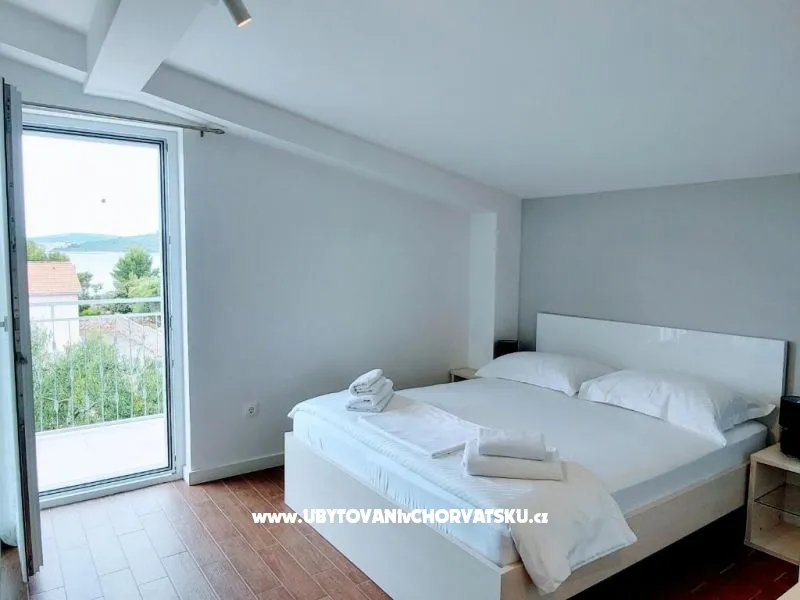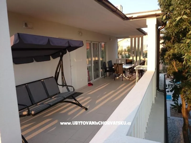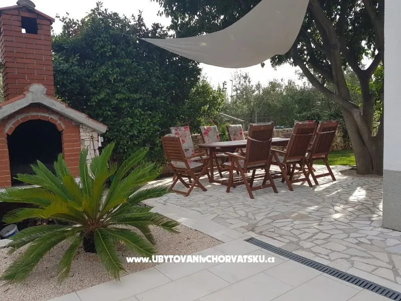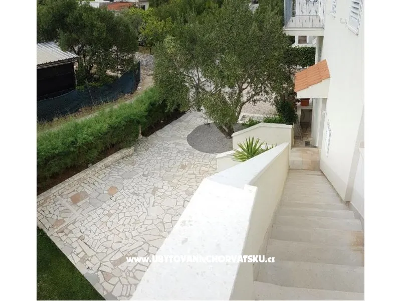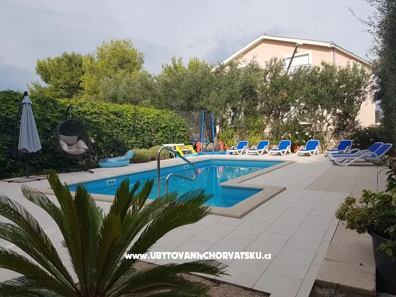 Dům se nachází na poloostrově, od Trogir 25 km a Primošten, 23 km, Split 48 km Dům má dvě podlaží. Přízemí: kuchyň, obývací pokoj, koupelna, dvě ložnice s koupelnou a manželskou postelí, pokoj s palandou, 2 klimatizační jednotky (jeden v obývacím pokoji, jeden na chodbě - pokoje) velká terasa 30m2, Z terasy vedou do zahrady a na bazén. V zahradní stůl pro 10 osob. Patro: kuchyň, obývací pokoj, dvě koupelny, dvě ložnice a manželskou postelí, pokoj s palandou, 4 klimatizační jednotky (jeden v obývacím pokoji, 3 - pokoje) velká terasa 30m2, Na zahradě je pokryta (stínové) parkoviště pro 5 automobilů. Na pláž je 100-120m východ a západ (poloostrov)