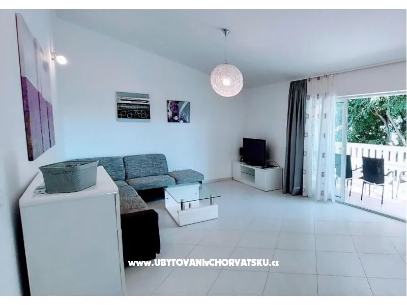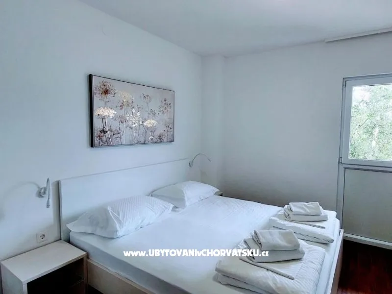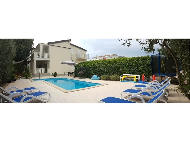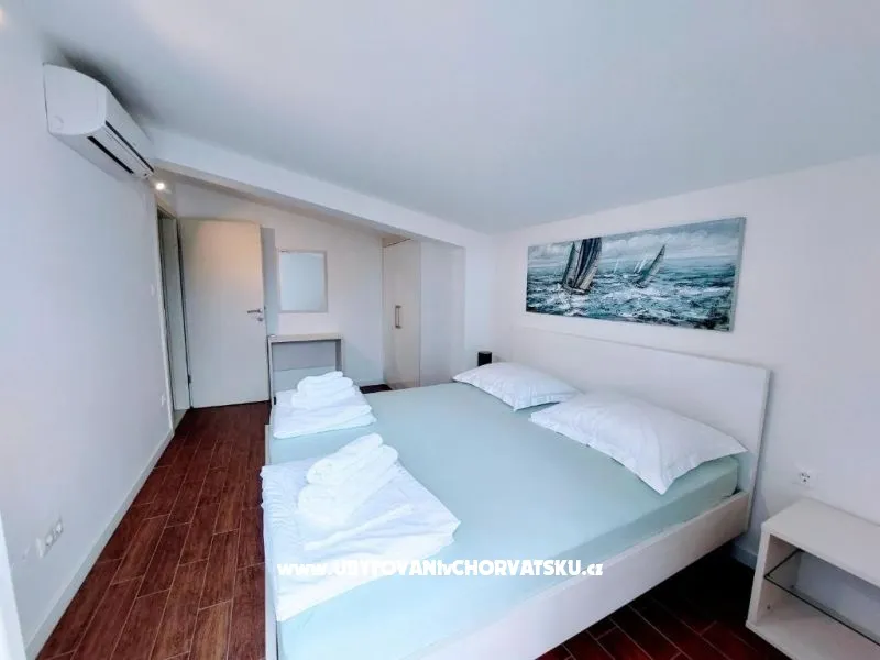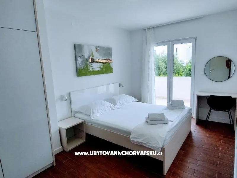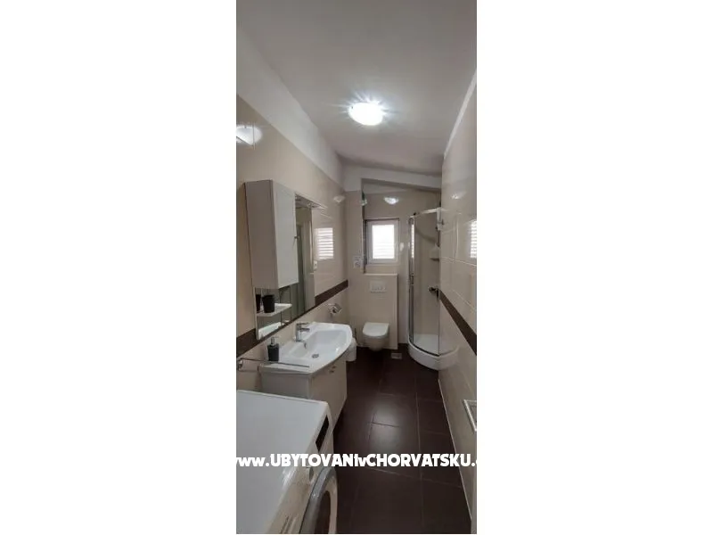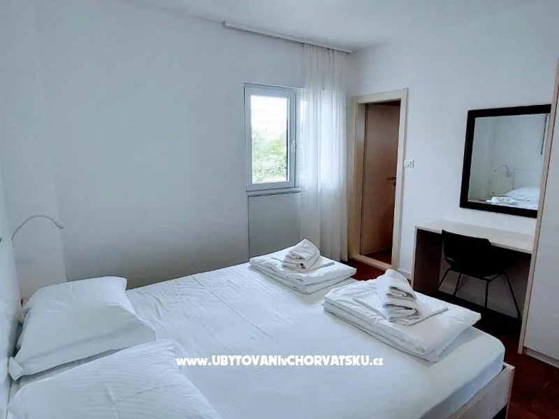 Dům se nachází na poloostrově, od Trogir 25 km a Primošten, 23 km, Split 48 km Dům má dvě podlaží. Přízemí: kuchyň, obývací pokoj, koupelna, dvě ložnice s koupelnou a manželskou postelí, pokoj s palandou, 2 klimatizační jednotky (jeden v obývacím pokoji, jeden na chodbě - pokoje) velká terasa 30m2, Z terasy vedou do zahrady a na bazén. V zahradní stůl pro 10 osob. Patro: kuchyň, obývací pokoj, dvě koupelny, dvě ložnice a manželskou postelí, pokoj s palandou, 4 klimatizační jednotky (jeden v obývacím pokoji, 3 - pokoje) velká terasa 30m2, Na zahradě je pokryta (stínové) parkoviště pro 5 automobilů. Na pláž je 100-120m východ a západ (poloostrov)