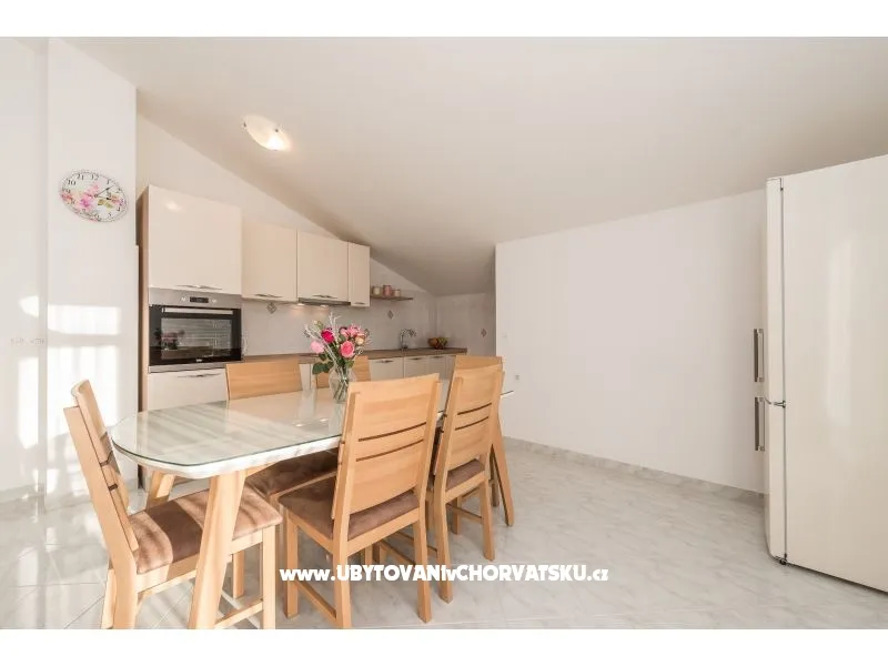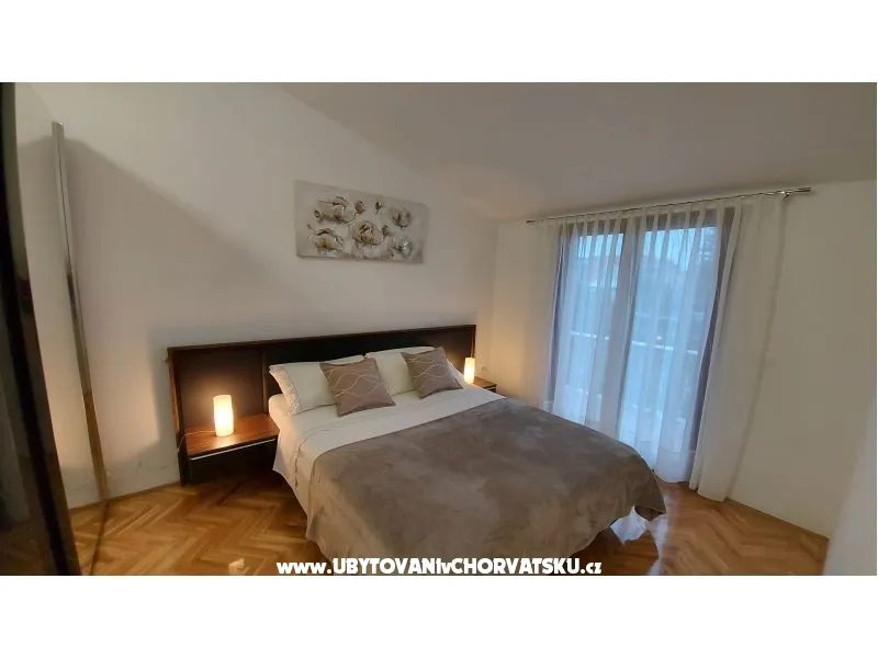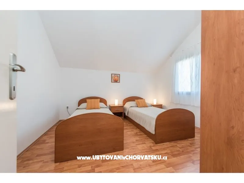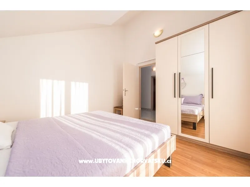 Klimatizovaný apartmán v patře rodinného domu se společným vchodem.WIFI, 3 ložnice, plně zařízená kuchyně s myčkou, obývací, koupelna, navíc wc, 3 terasy z toho 2 s výhledem na moře. Apartmán je obklopen velkým dvorem ideálním pro děti, se zahradou a zahradní sprchou a prostorným parkovištěm.