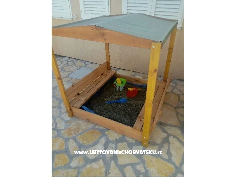 Velká koupelna se sprchovým koutem, manželskou postelí a rozkládací pohovkou vedle. Kuchyň je dobře vybavená, vše z roku 2019. Trezor, TV, fén. Pračka v přízemí domu. Na terase je lehátko, stůl a židle.