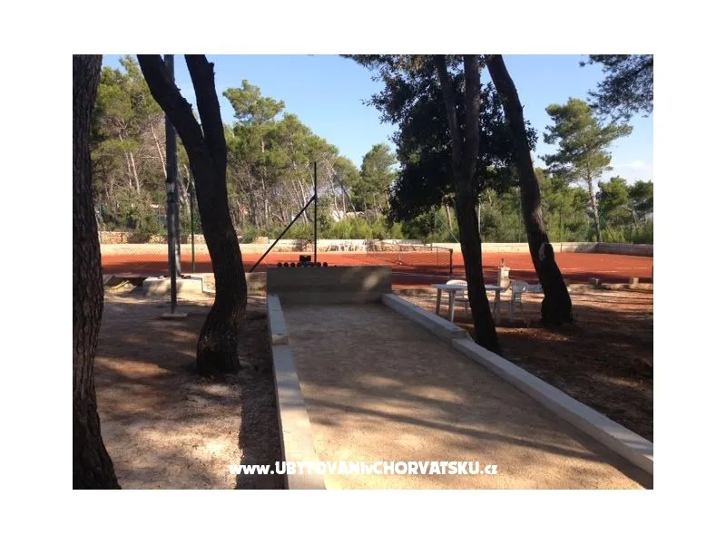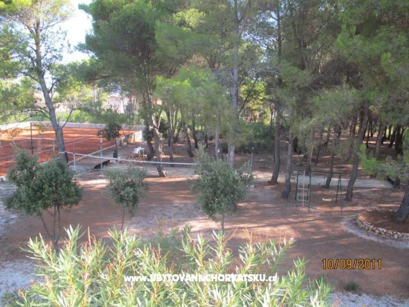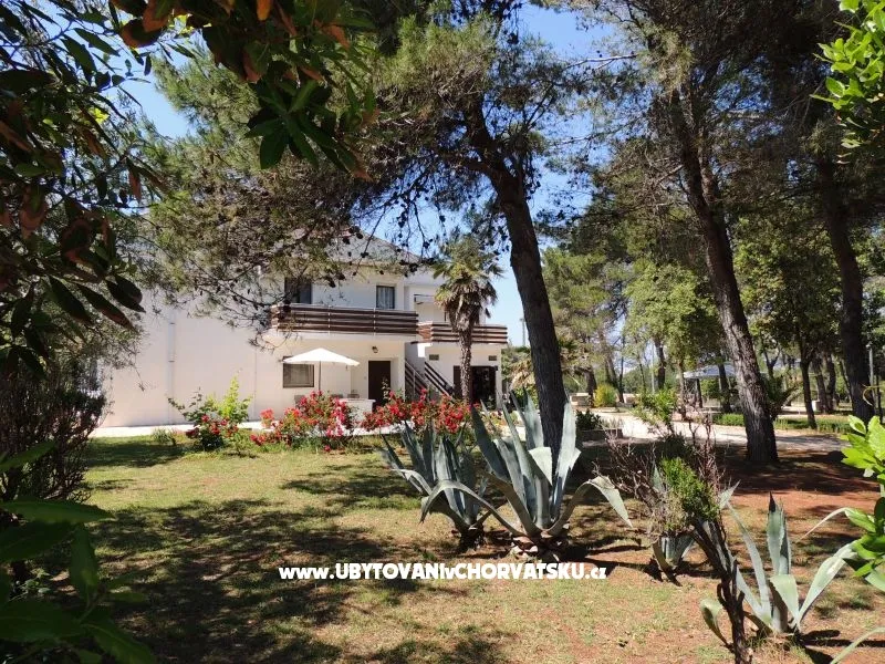 Apartmány jsou situovány v třípodlažním domě středomořském stylu uprostřed borového lesa, pouhých 150 metrů od pláže. Každý ze čtyř apartmánů je nově zrekonstruován a vybaven vším potřebným, aby se host cítil jako doma. Kuchyňské spotřebiče, klimatizace, televize se satelitem, komfortní koupelna a balkony jsou nedílnou součástí každého z nich. Dům je jen 1000 m od centra, 50 m od pekárny, 400m od obchodů, 300 m od restaurace. Zahrada s 30 000 m2 plochy je nedílnou součástí všech apartmánů a je k dispozici pro své návštěvníky, nabízí jim zábavu a odpočinek během dne a večera. Všichni hosté mají k dispozici gril, stůl ve stínu borovic a lehátka pro relaxaci. Fíky, hrušky, švestky, hrozny a různé byliny, které jsou v zahradě si hosté mohou za doprovododu domácích utrhnout a ochutnat kouzlo středomořské stravy. Ti, kteří si neumí představit dovolenou bez sportu se nabízí antukový tenisový kurt, petangue, volejbalové hřiště a jogging stezka ve stínu borovic. Pro děti je k dispozici koutek s houpačkami a pískoviště jakož i les obehnaný kamennou zdí.