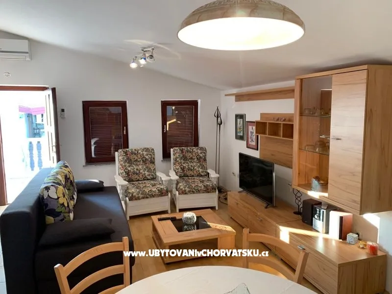 Pronájem apartmánu na ostrově Vir. Apartmán má 3 ložnice, koupelnu, kuchyni s jídelnou a obývacím pokojem a terasu s výhledem na moře. Apartmán je klimatizovaný, s TV a satelitem a dalším vybavením. Apartmán se pronajímá od 1.5. do 1.11.